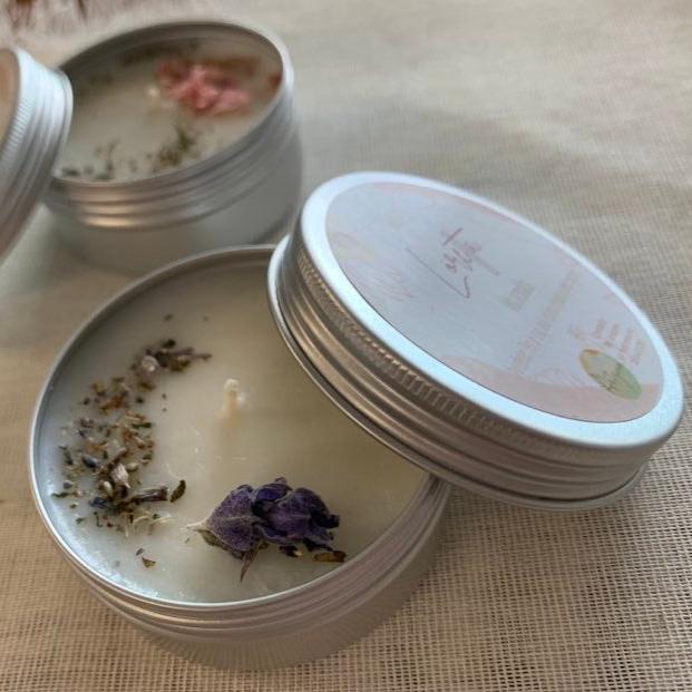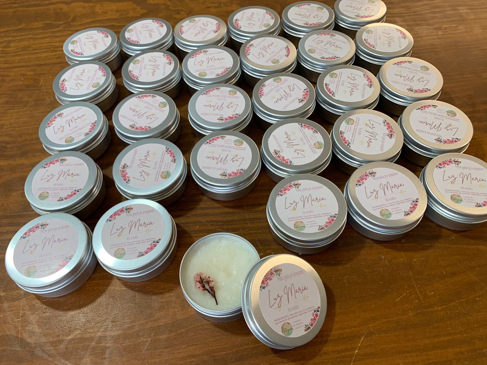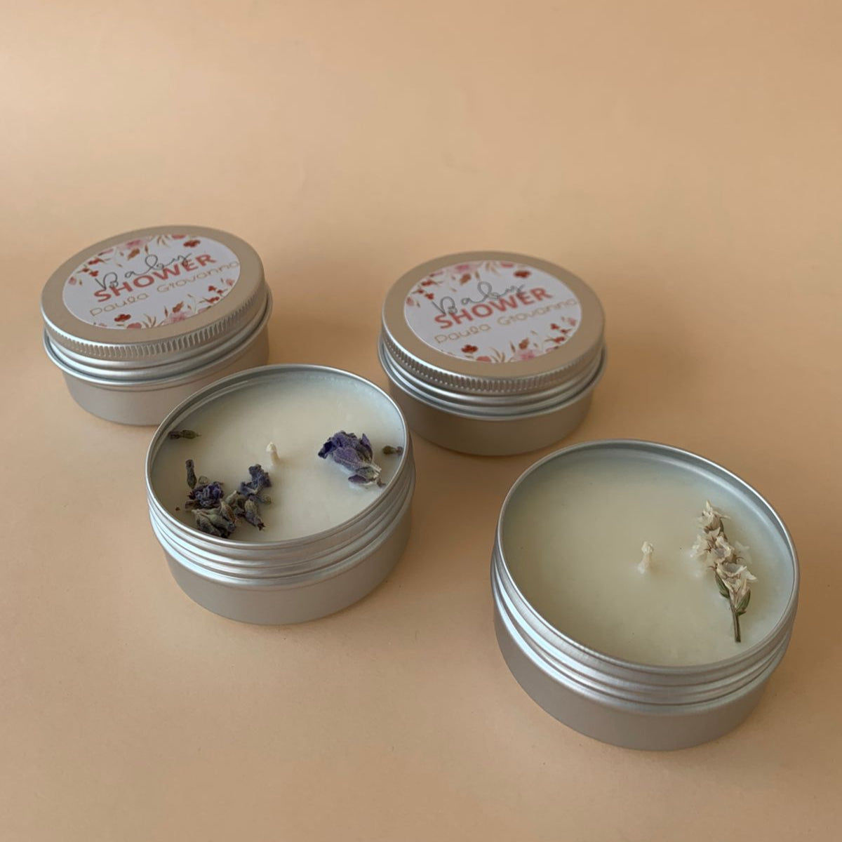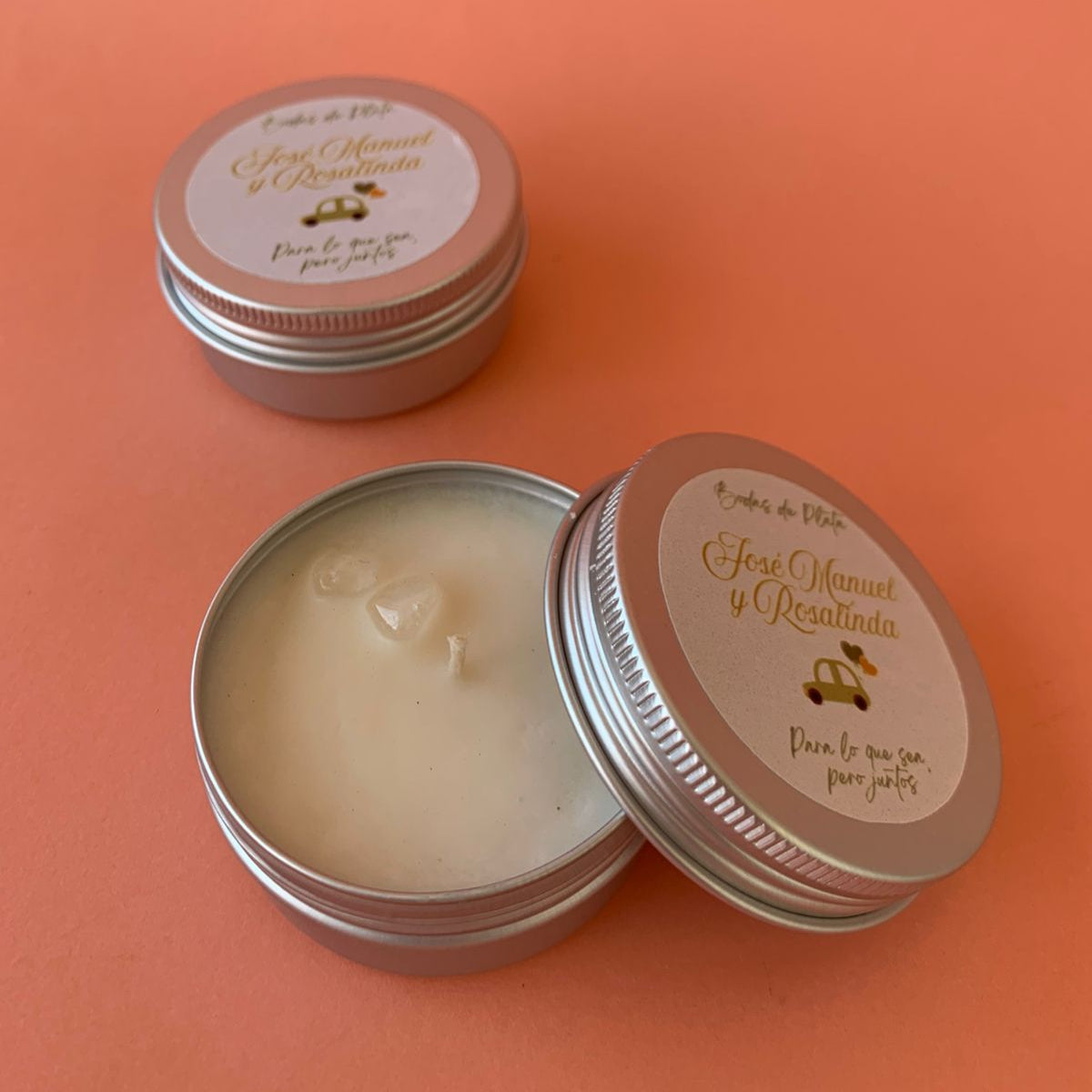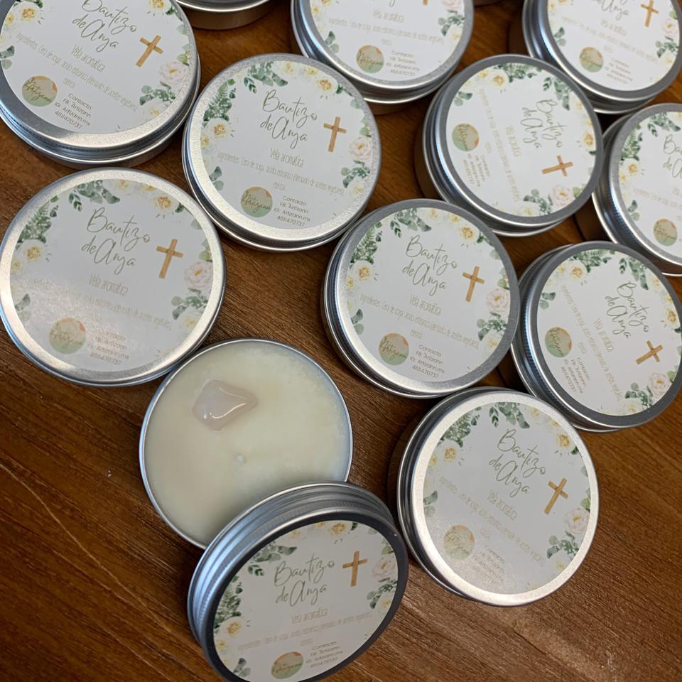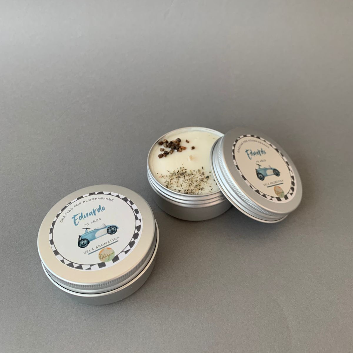 🩶Vela aromática de cera de soya de 50 gramos aproximadamente en lata de aluminio (este peso se toma durante la fabricación del mismo), cada vela se entrega personalizada con la etiqueta de tu evento.